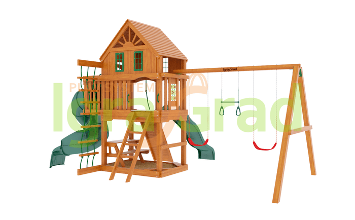 - двухуровневый домик с красивыми пластиковыми окошками;