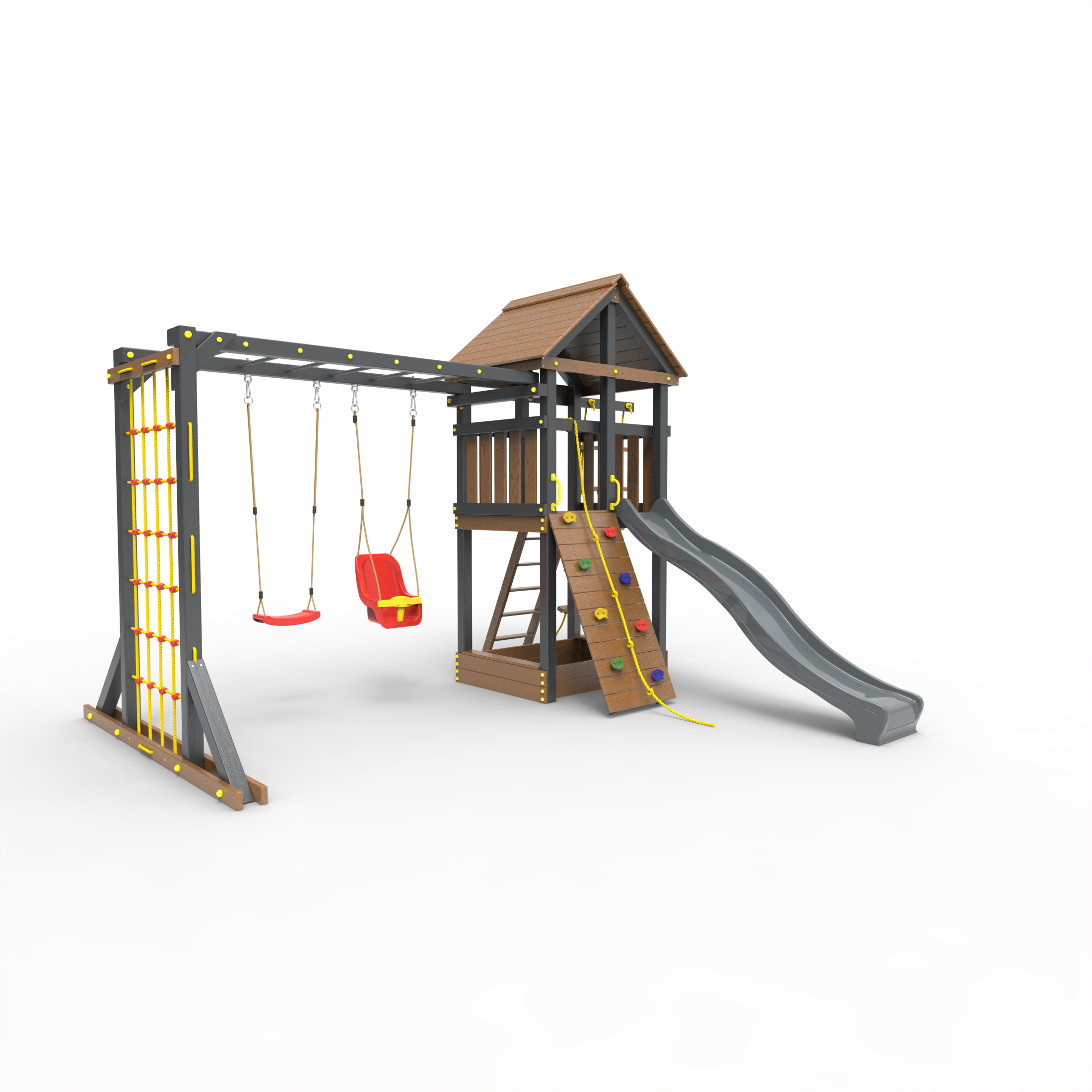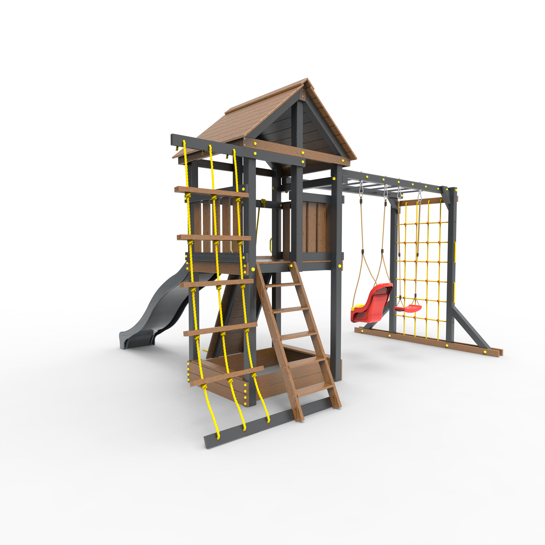 Обращаем Ваше внимание, что фактический цвет детской площадки может отличаться от представленных фото на сайте. Специфика окраски нетоксичными пропитками и красителями допускает отклонения в цветовой гамме отгружаемых изделий. Также обратите внимание, что фактический цвет может отличаться из-за цветопередачи устройства на котором Вы смотрите фото. Производитель оставляет за собой право менять цвет отдельных деталей и комплектующих(включая пластик, канаты и пр.), при этом сохраняя весь функционал и характеристики товара.