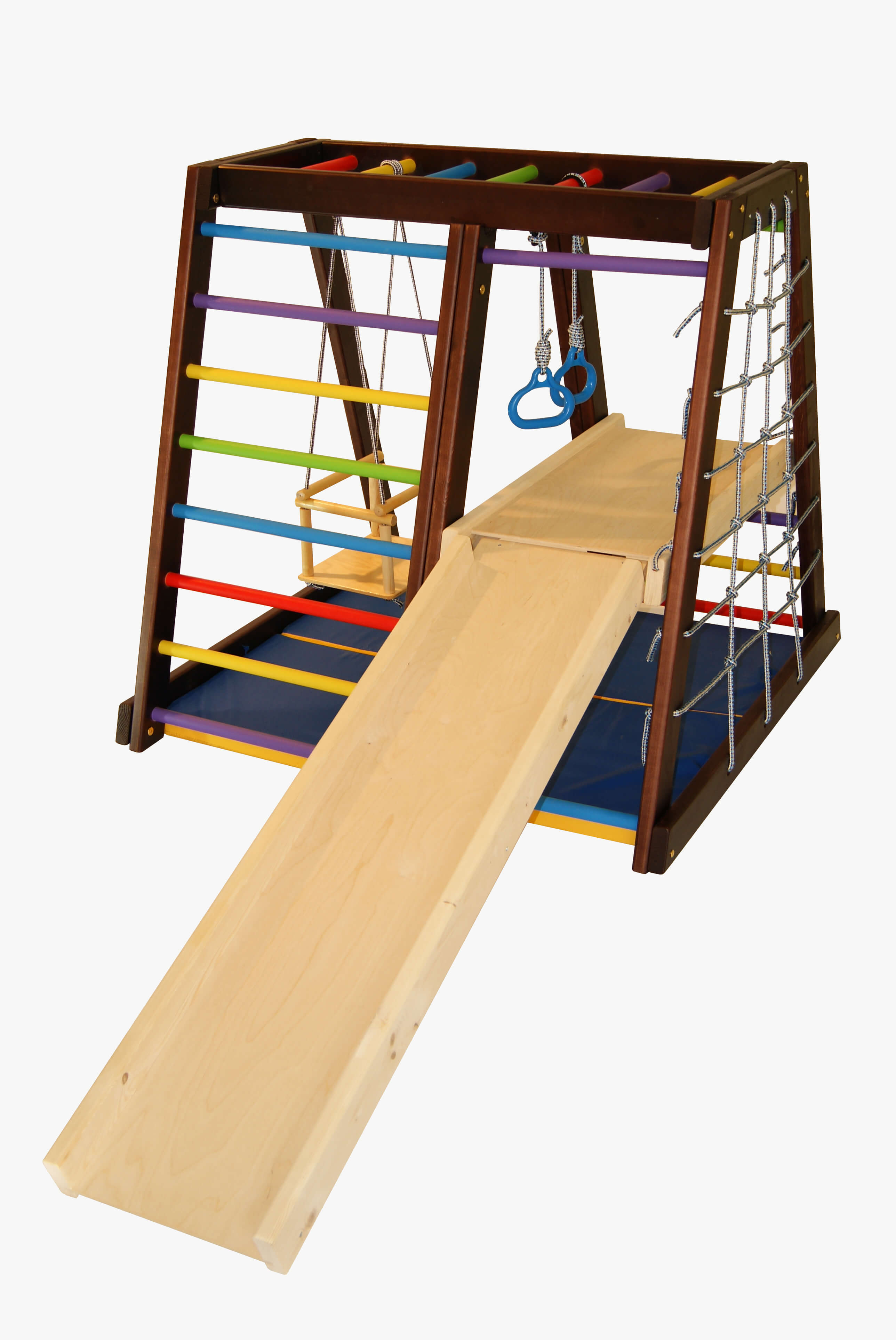 - максимальная комплектация включает в себя шведские стенки, рукоход, сеть для лазанья, страховочный мат, качели, гимнастические кольца, а также горку с удобной площадкой.