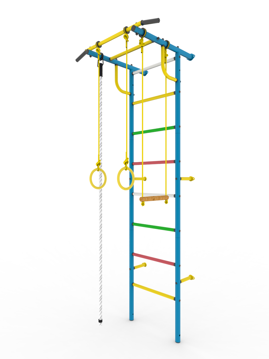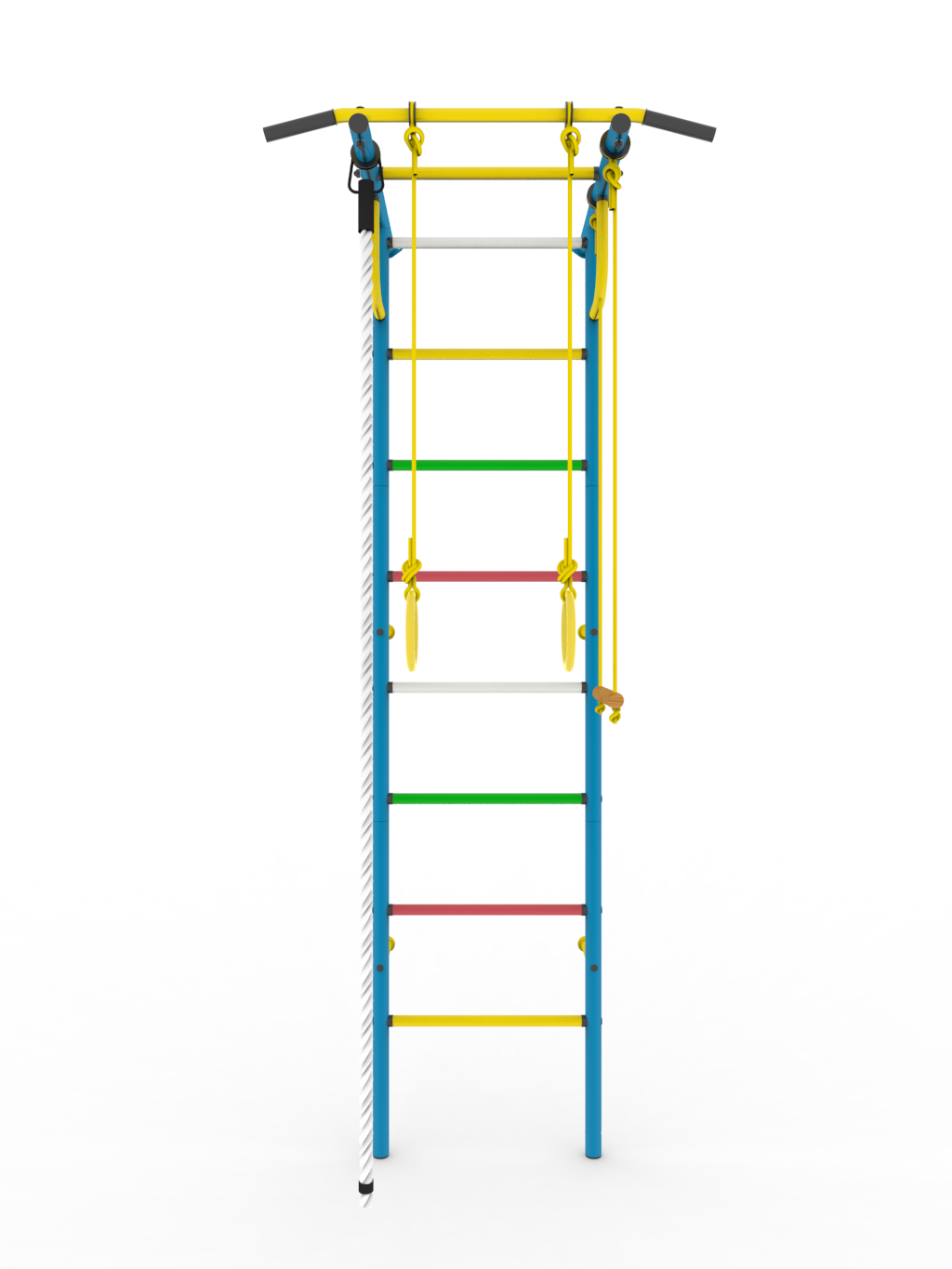 - Комплектация: турник, кольца гимнастические, канат, трапеция