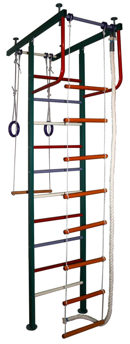 Комплектация: цветные перекладины, турник с узким хватом, металлическая шведская стенка, канат, кольца гимнастические, трапеция, турник