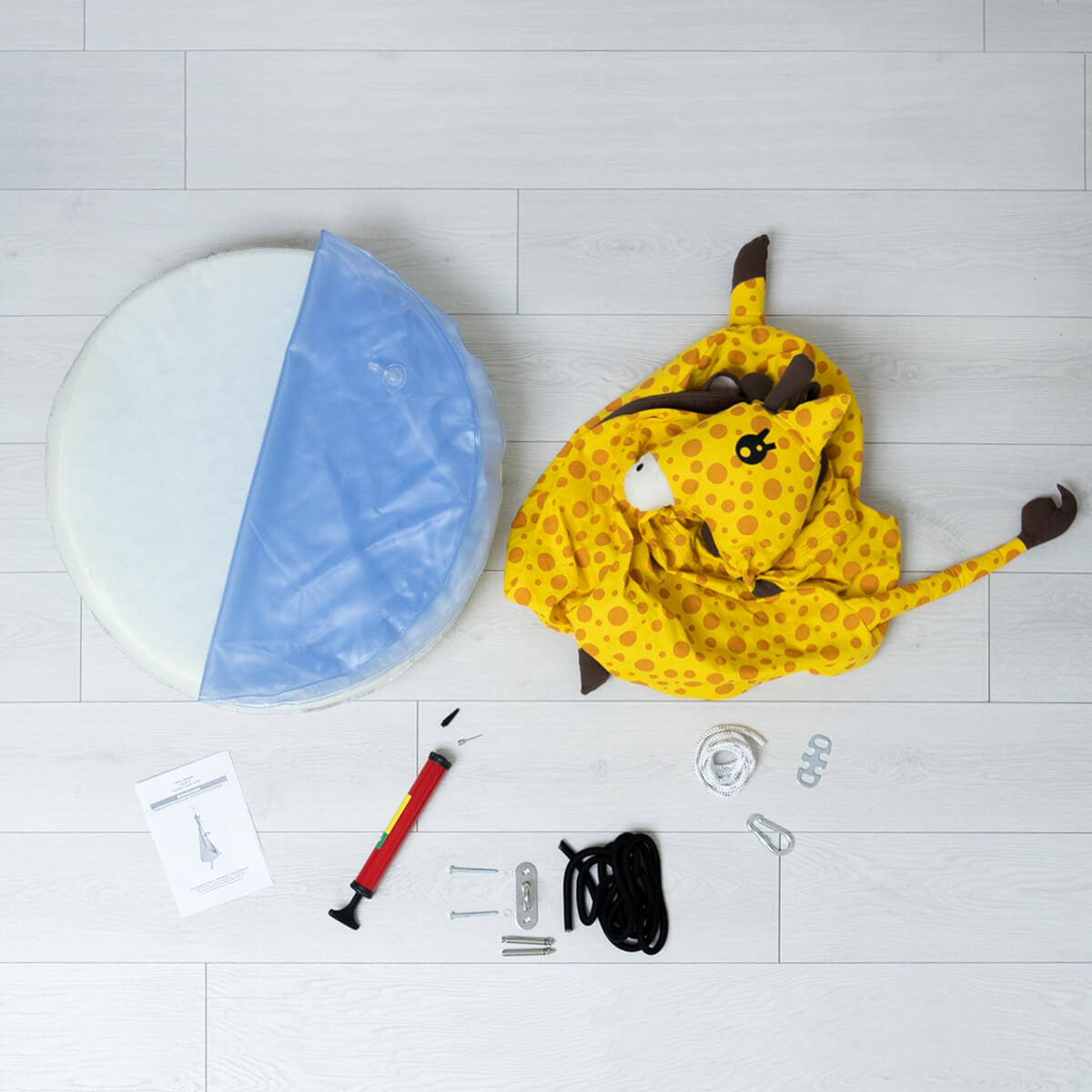 В комплект входит гамак и два вида сиденья к нему (подушка надувная и из поролона), а также насос, крепежи и шнуры для монтажа изделия.