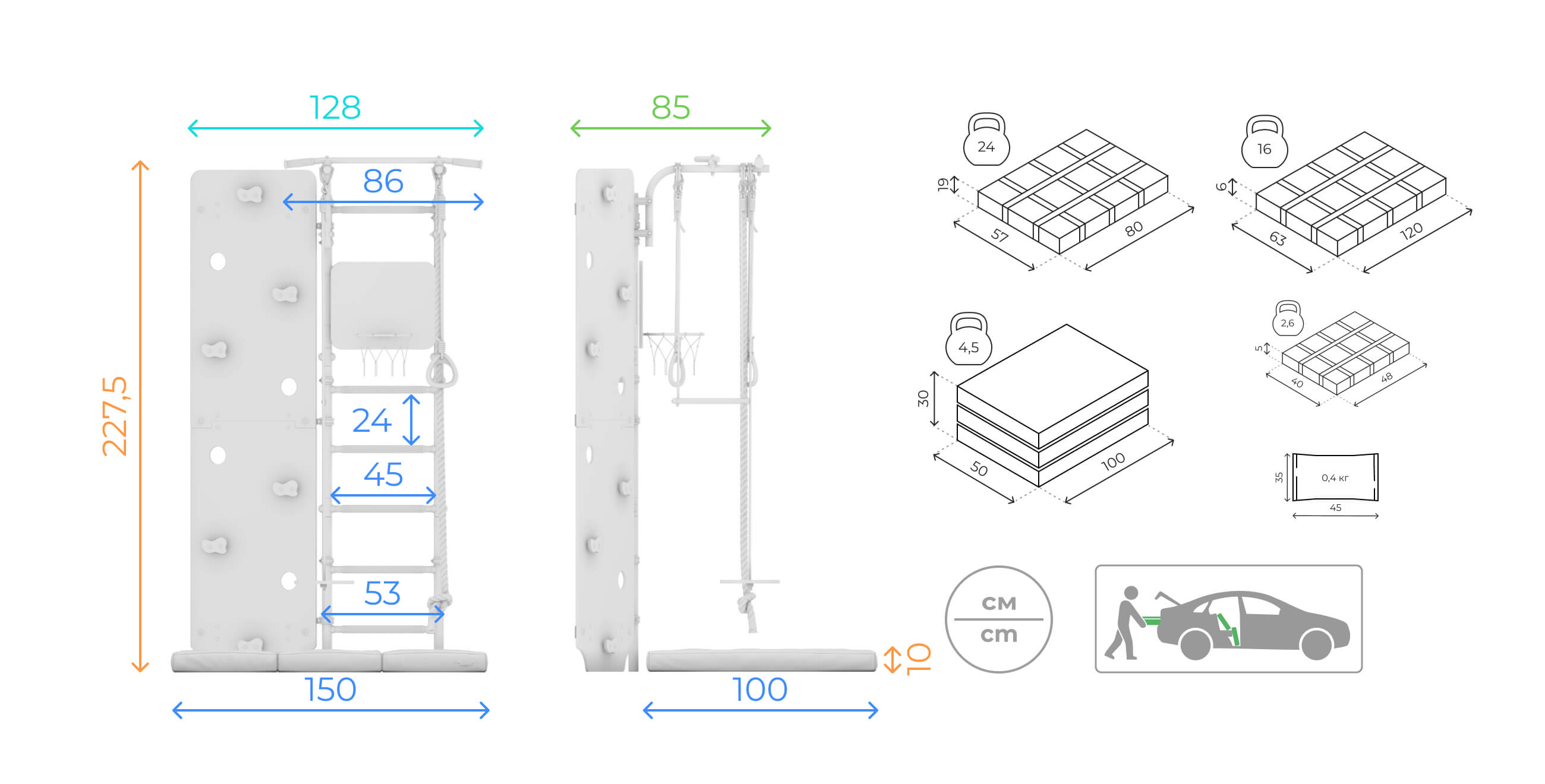 Шведская стенка представляет собой полноценную игровую зону, и включает всевозможное дополнительное оборудование: кольца, канат, подвес, скалолаз и трапеция. Безопасность во время активного досуга обеспечивает мат толщиной 100мм. Благодаря складной конструкции, мат легко разложить или убрать. Подвижный турник можно регулировать, в зависимости от роста человека. В комплект также входит баскетбольный щит. Обилие элементов позволяет обеспечить всестороннее физическое развитие.