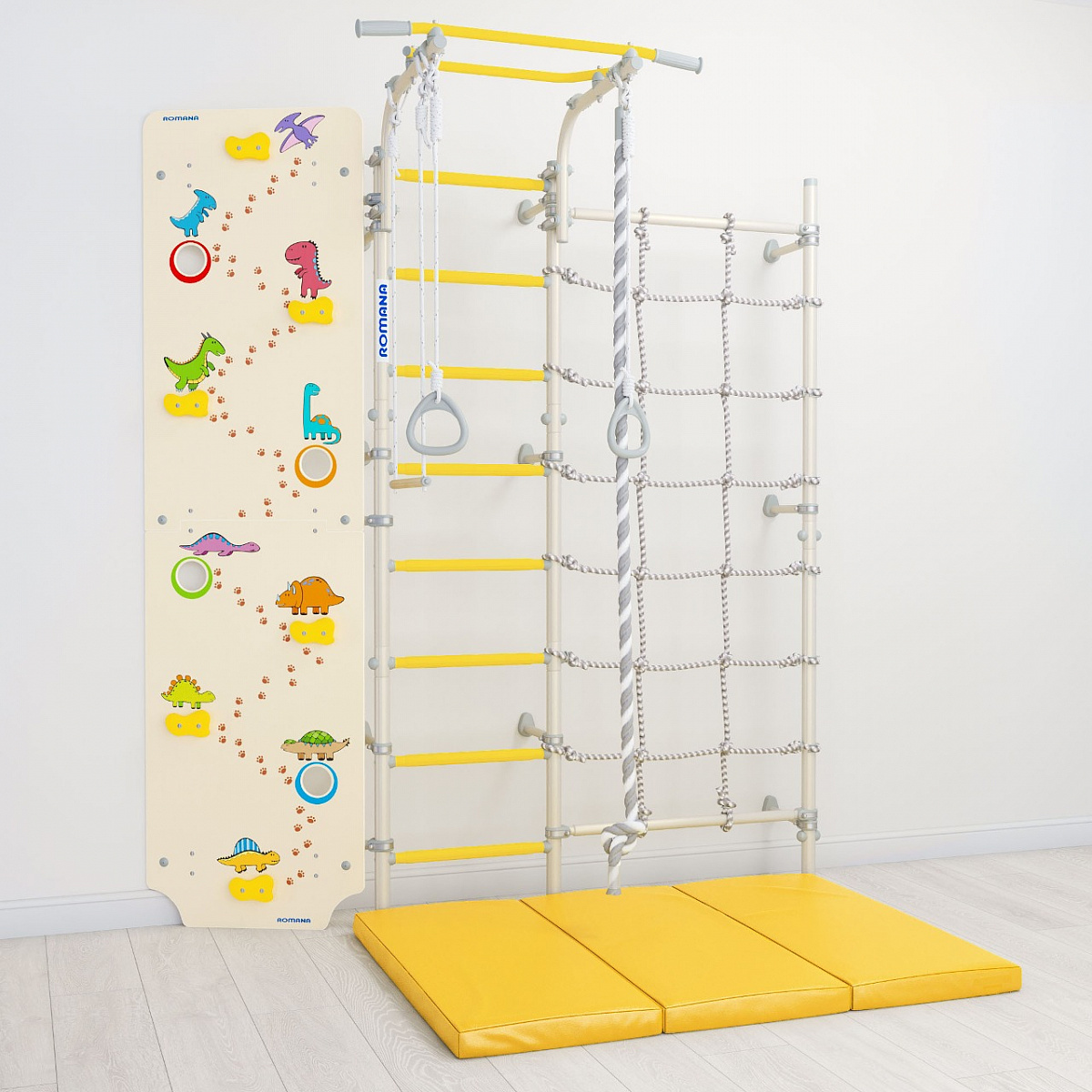 Яркий скалолаз с динозавриками дополняет тренажер. Обилие элементов способствует разнообразной физической активности. Занятия на таком комплексе обеспечивают всестороннее развитие ребенка, увеличивают показатели силы, ловкости и выносливости, развивают моторику и координацию.