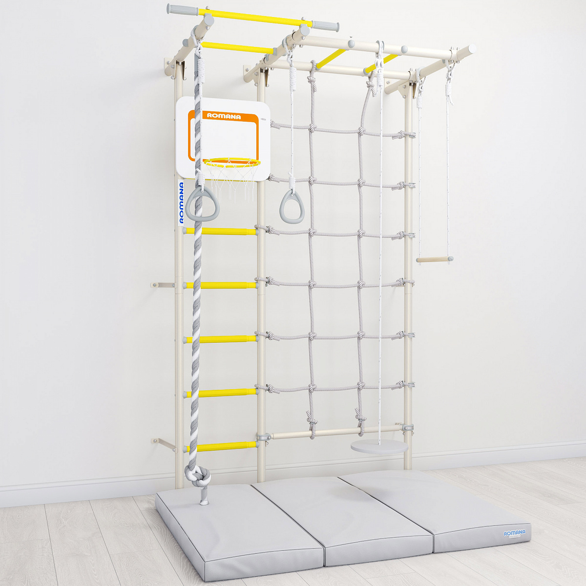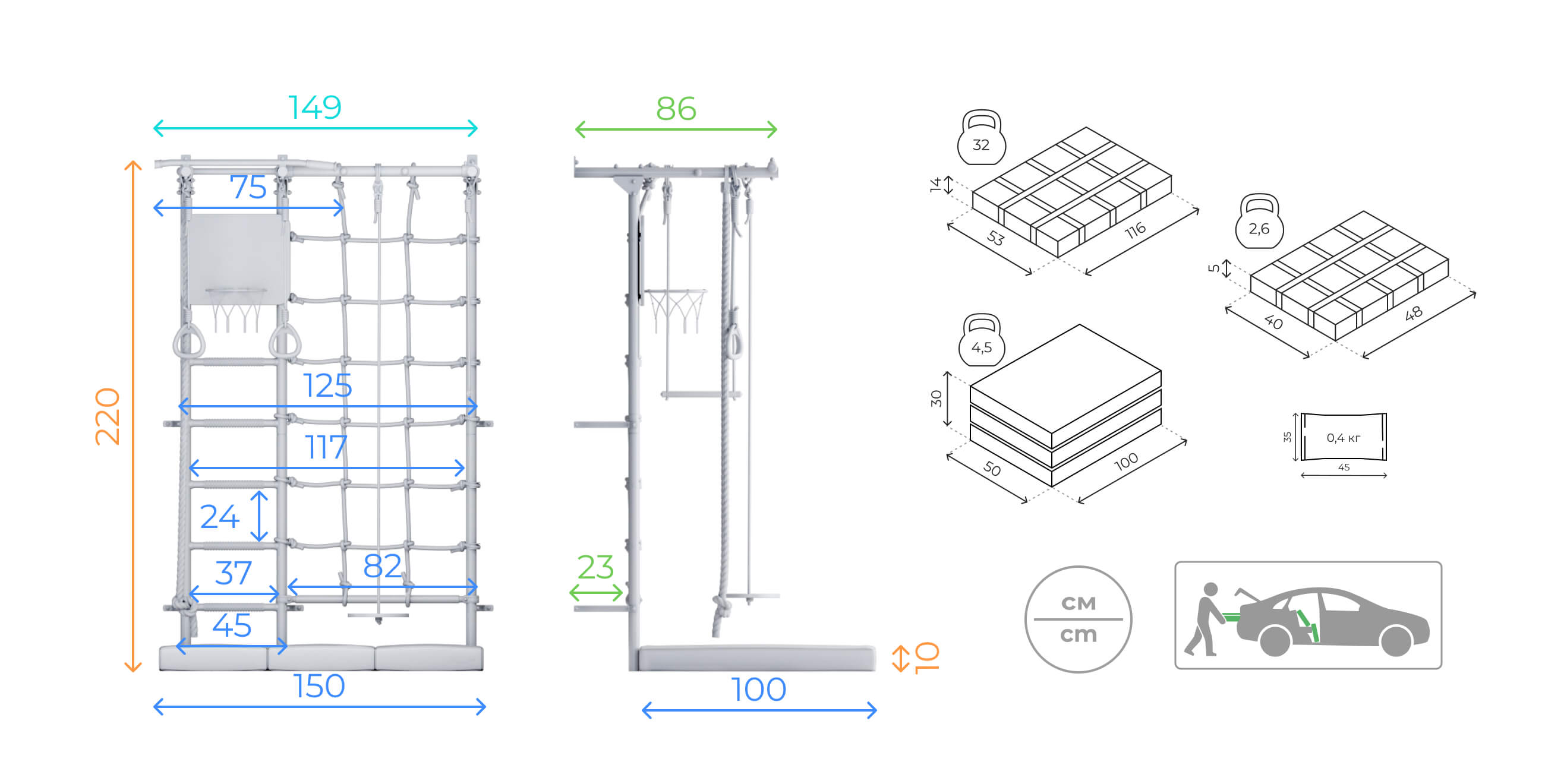 Шведская стенка укомплектована разнообразным навесным оборудованием: кольцами, трапецией, турником, рукоходом, подвесом, веревочным лазом, баскетбольным щитом и канатом. Складной мат толщиной 100мм создает зону безопасности при занятиях на шведской стенке.
