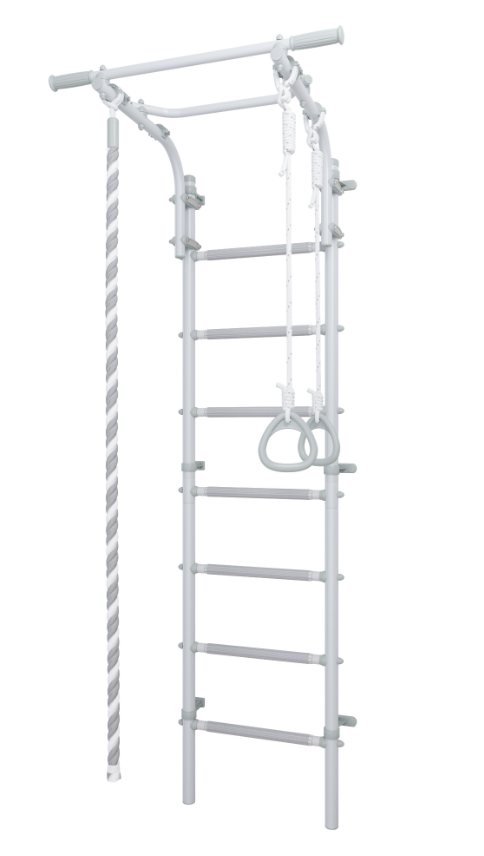 Серый цвет ступеней гармонично сочетается с серым корпусом, спортивный уголок стильно выглядит в любом интерьере.